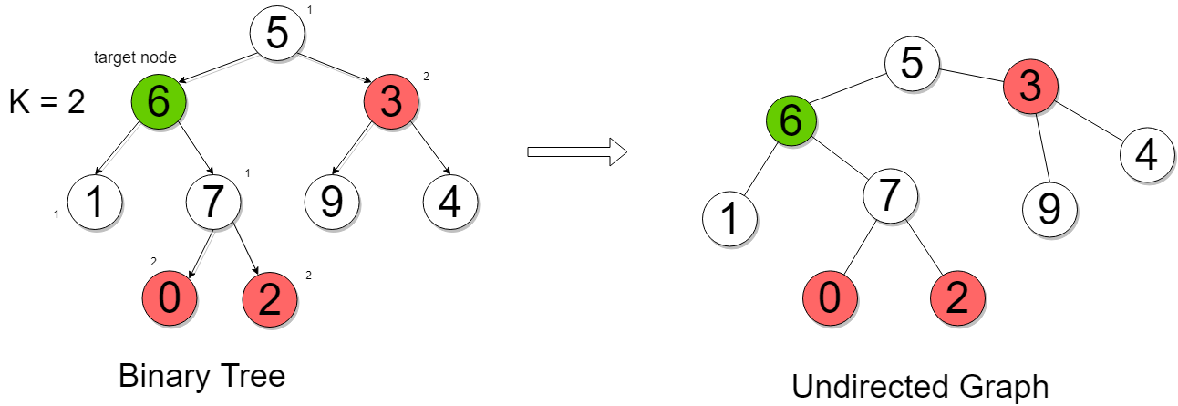 The question says, that we have to find out all the nodes that are at a distance of K from the target node. If you are able to imagine that the given directed binary tree to be an undirected graph, then we could perform a BFS search from the target nodes up to the distance K, then it would be our answer.