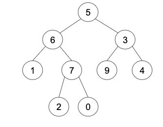Given the following binary tree: root = [5, 6, 3, 1, 7, 9, 4, null, null, 2, 0]