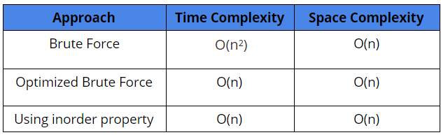 Time Complexity: Inorder traversal of BST for storing elements in arr[] + Single loop to check arr[] is sorted or not = O(n) + O(n) = O(n)