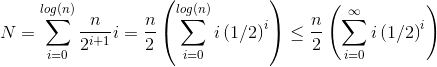 At height i, we've shown (above) that there will be n/(2^i+1) elements that need to call heapify, and we know heapify at height i is O(i). This gives: