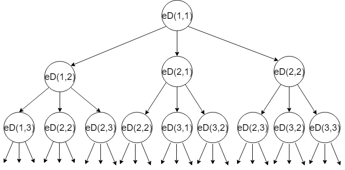 The above diagram represents the recursive structure of edit distance (eD). The parameters represent the i and j pointers. Now you may notice the overlapping subproblems. Eg. eD(2, 2)