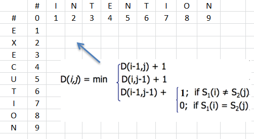 editDistance(i+1, j+1) = 1 + min(editDistance(i,j+1), editDistance(i+1, j), editDistance(i,j))