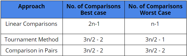 If n is a power of 2, the algorithm needs exactly 3n/2–2 comparisons to find min and max. If it's not a power of 2, it will take a few more(not significant).