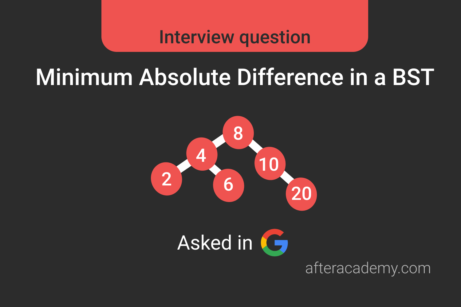 This is an interview problem asked in Google technical interview. Given a BST(Binary Search Tree) with non-negative values, write a program to find the minimum absolute difference between values of any two nodes.