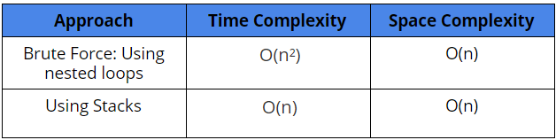 Time Complexity: Initializing ans[] array with -1 + Traversal of the array and Stack Manipulation = O(n) + O(2*n) (Why?) = O(n)