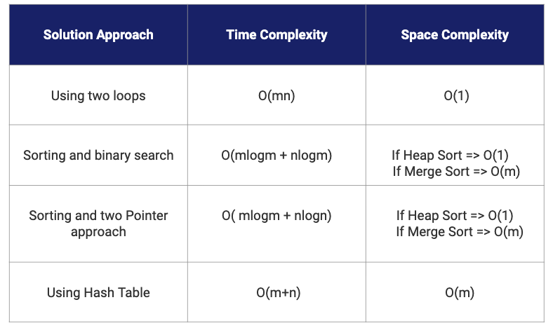 There are two loops in the solution where one loop is running m times and other n times. So in the worst case, Time Complexity = O(mn), Space Complexity = O(1). But the critical question is - how can we improve the time complexity?