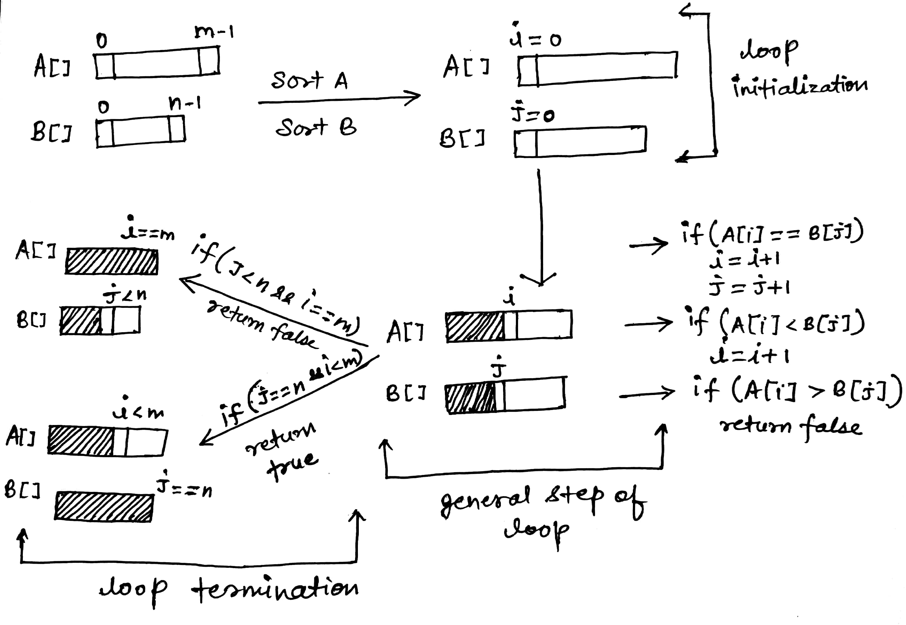 If both A[] and B[] are sorted then we can apply the idea of two pointer approach of merge type process. In this approach, we start from the first element of both sorted arrays. At each step of the iteration, we compare one value from B[] with one value from A[] and move forward. On the basis of comparison, we can check if all elements of the sorted array B[] are found in sorted array A[].