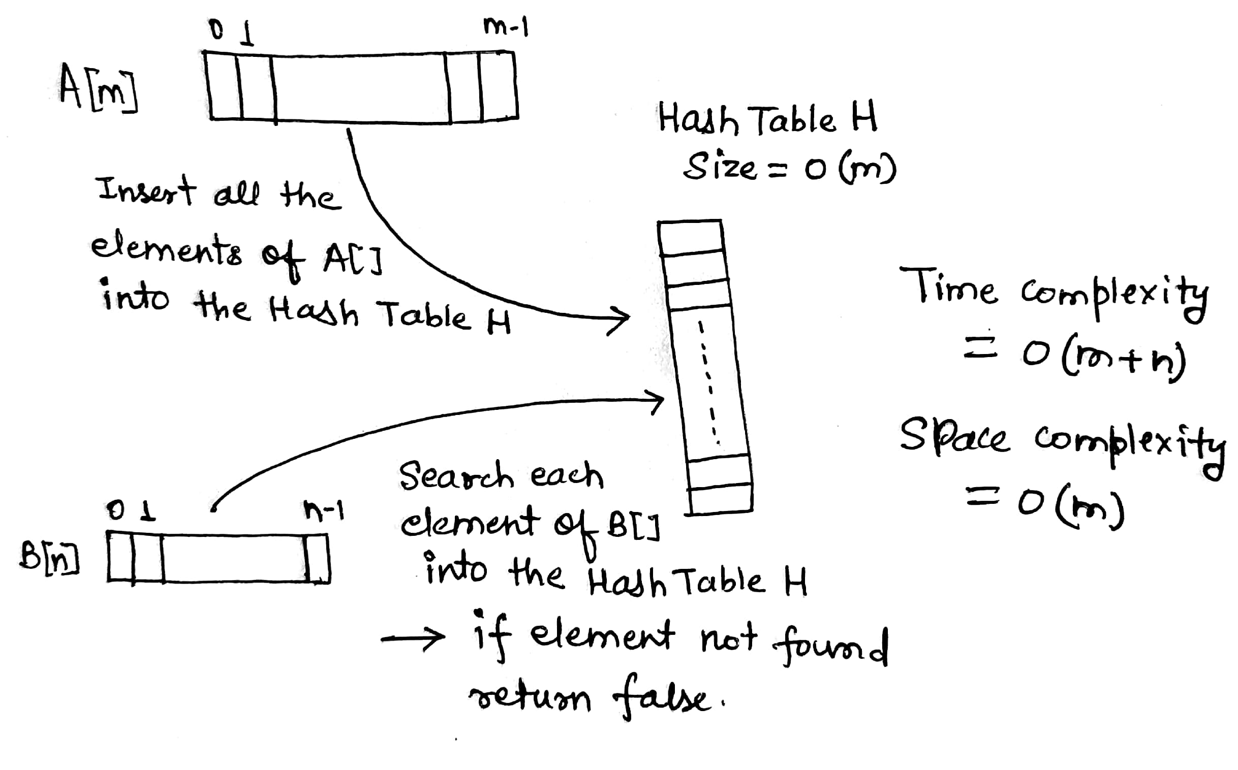 Time Complexity = Time complexity of inserting m elements of A[] in hash table + Time complexity of searching n elements of B[] in hash table = m. O(1) + n . O(1) = O(m) + O(n) = O(m+n)