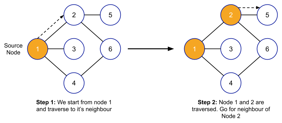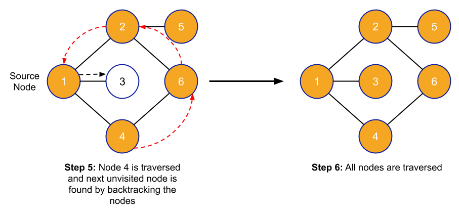 All you need to do is just select one path and traverse to the end of this path and after that, come back to the previous node and traverse the nodes that are connected to those nodes and this process is going to continue again and again until there is some node that is not traversed.