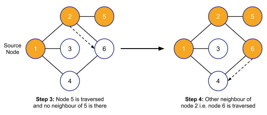 In DFS, we keep on visiting the nodes until there is some neighbour node and if there is no neighbour node then we backtrack to the previous node and again we will visit all the nodes ahead of that node. This can also be performed with the help of the exhaustive search.