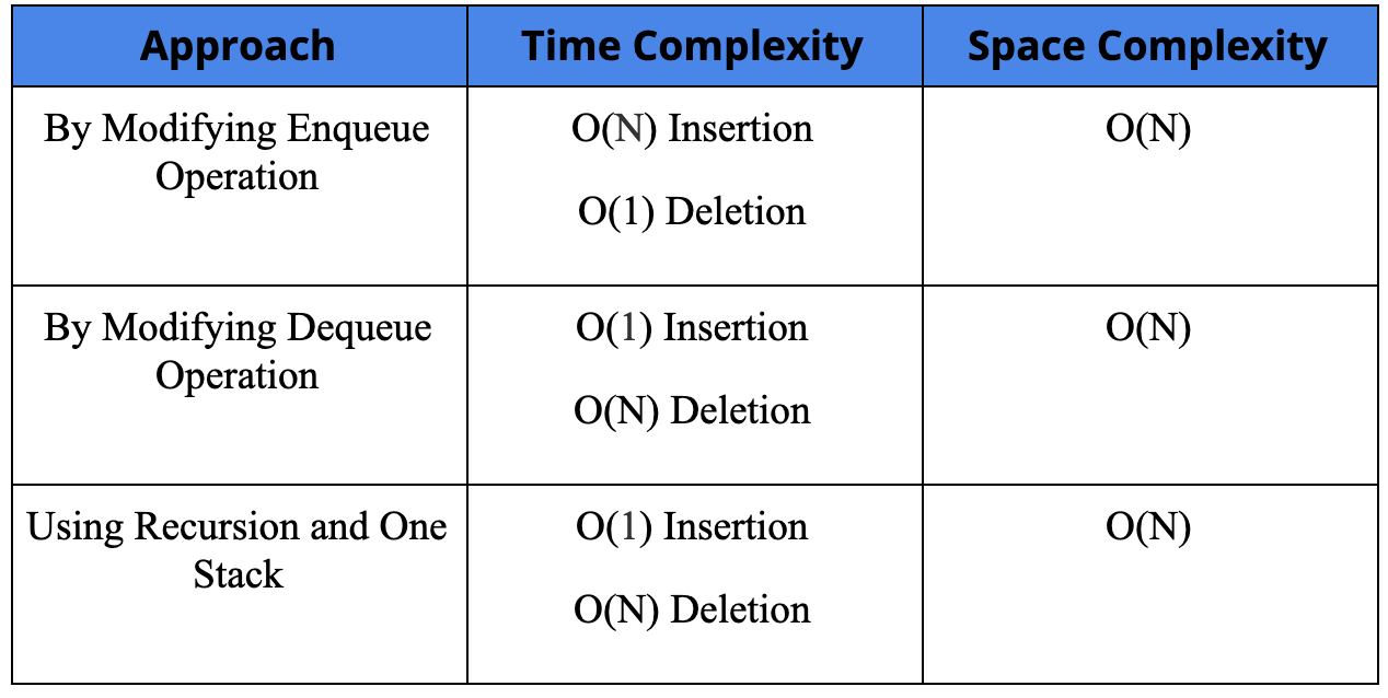 Time Complexity: O(N) for dequeue and O(1) for enqueue.