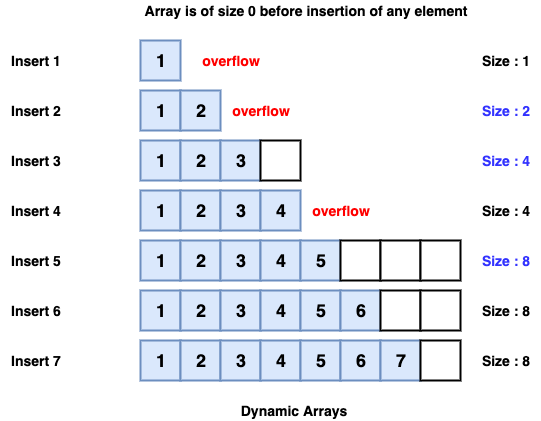One limitation of arrays is that they’re fixed size, meaning you need to specify the number of elements your array will hold ahead of time. So, here comes the concept of Dynamic Array. A dynamic array expands as you add more elements to it. So you don’t need to determine the size ahead of time. Usually, when the array is full, then the array doubles in size.