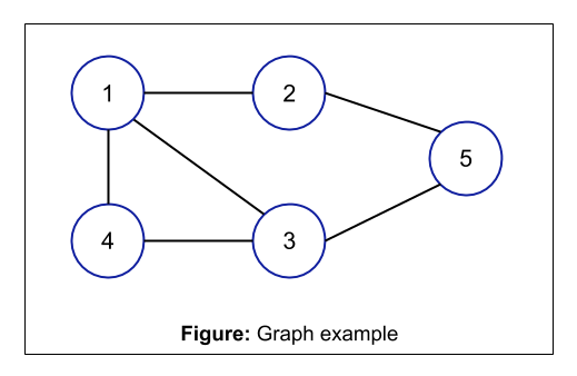 The above is an example of Graph having a set of vertices as V = {1, 2, 3, 4, 5} and the set of edges as E = {1-2, 1-3, 1-4, 2-1, 2-5, 3-1, 3-4, 3-5, 4-1, 4-3, 5-2, 5-3}.