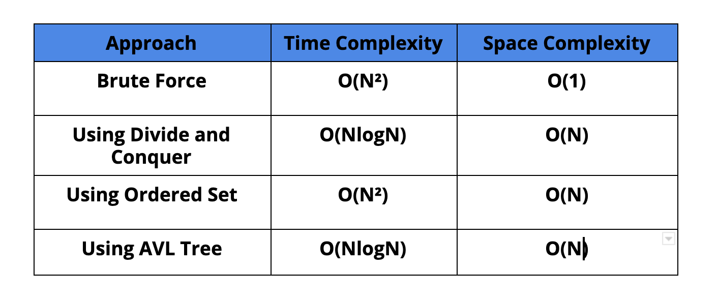 We are going to see four different solutions to this problem. The first one will be an obvious, brute force solution while in the second solution we will work on optimisation and come up with an efficient solution. The third solution will be based on using an ordered set and the fourth one will use the AVL tree to solve this problem.