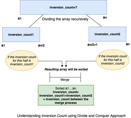 This solution idea is based on the divide and conquer algorithm. Here, we will be dividing our array into two halves similar as in the merge sort algorithm. For each half, we will be getting the inversion counts using recursion. The total counts of inversion will be the sum of inversions in the first half, second half as well as the inversion counts during the process of merging.