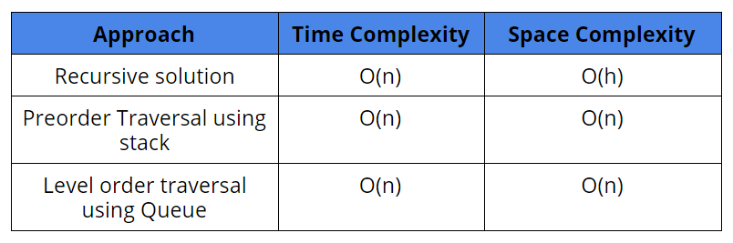 In the above approach, we are traversing each node of the tree only once. Time complexity: O(n)
