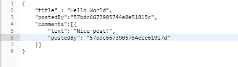 As you can see, we're using the populate function of mongoose to join the documents when querying for Posts. The first call to populate joins the Users for the postedBy property of the posts whereas the second one joins the Users for the comments.