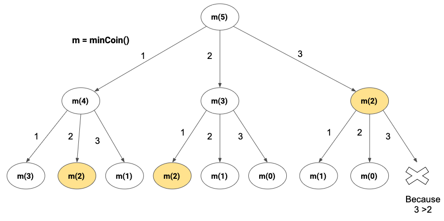 When we draw the recursion tree of the above problem for say A=5 and C ={1,2,3}, the tree comes up with same sub-problems again and again (Look at the below tree, here the colored eclipse is shown for such sub-problems). If we increase the amount A and draw the recursion tree, the number of overlapping problems will also increase.
