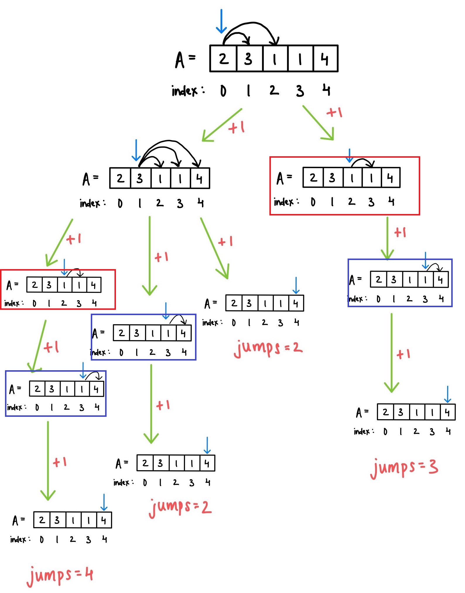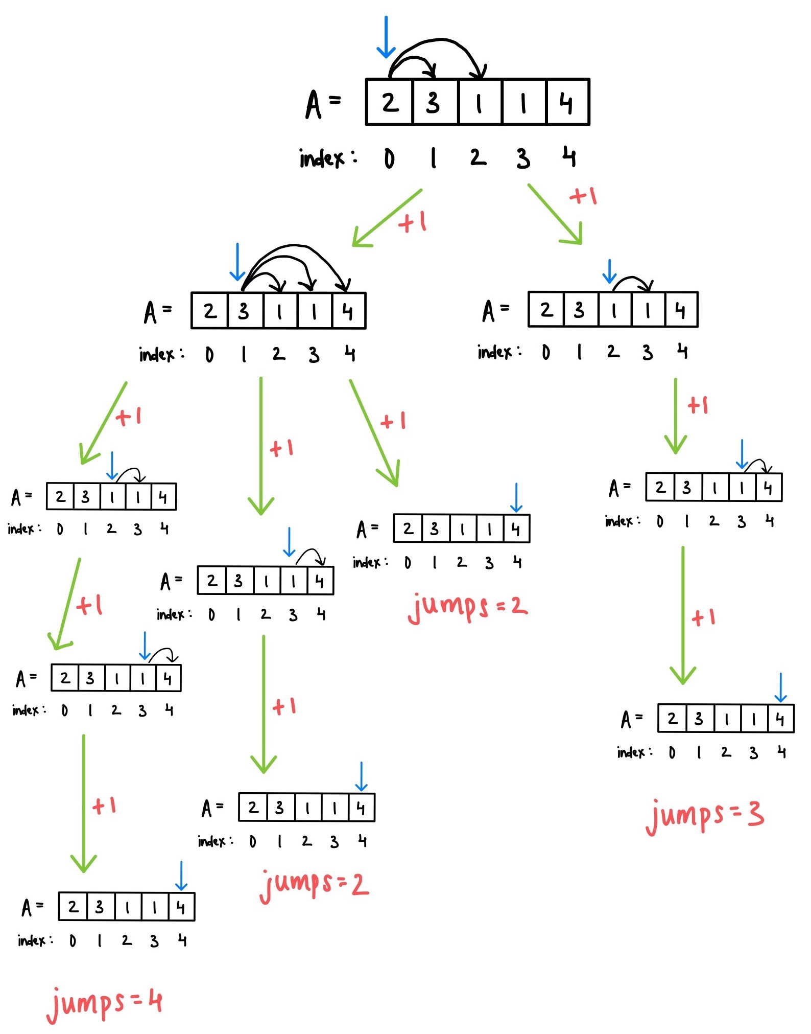 In other words, from start move to all such indexes that are reachable from start and then recursively get the minimum number of jumps needed to reach the end from these reachable options.