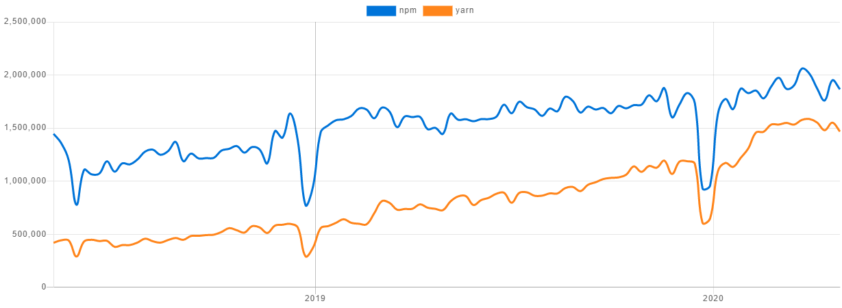 This is the comparison of npm downloads vs yarn downloads over the past 2 years