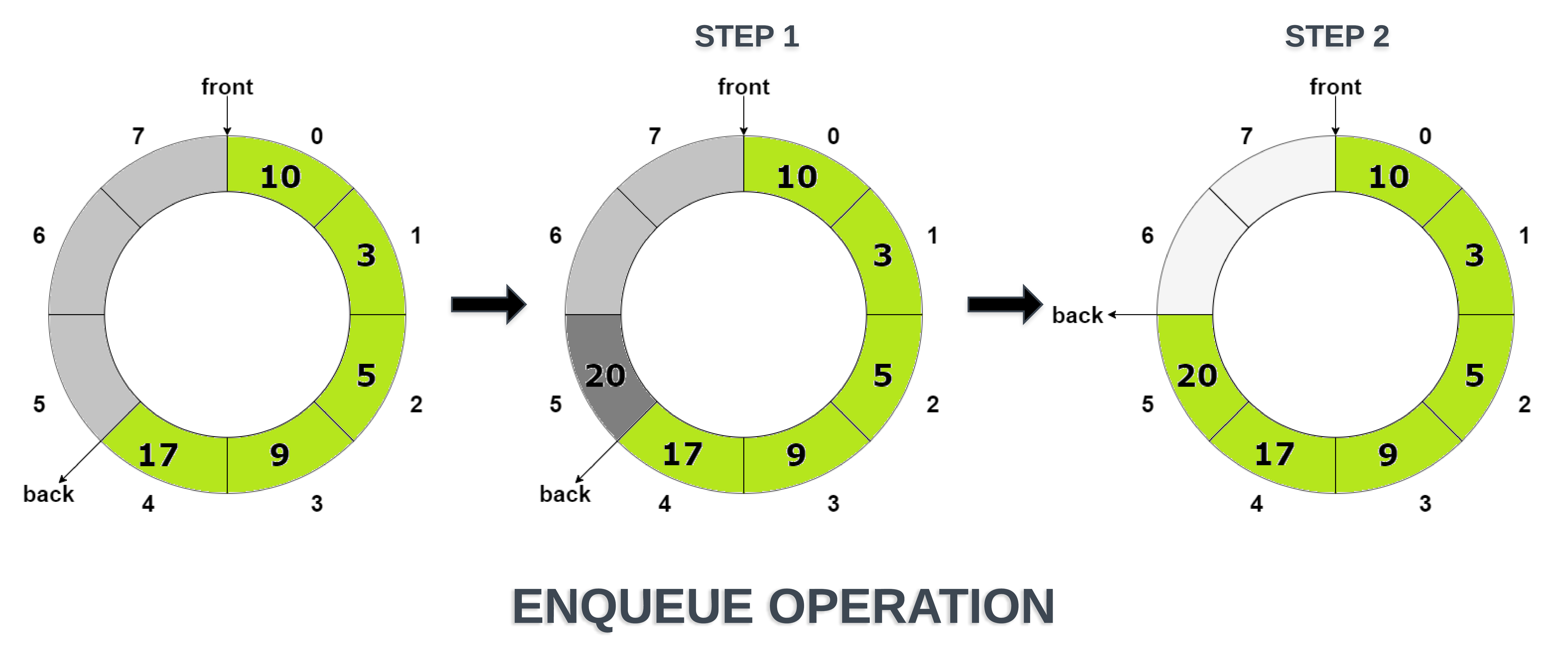 → Well, Step 2 is mainly deallocating any memory assigned to the element being dequeued. We were dealing with only primitive data type integer and therefore didn't need to deallocate anything.