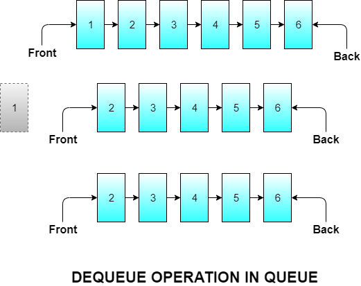 Dequeue means removing an element from the queue. Since queue follows the FIFO principle we need to remove the element of the queue which was inserted at first. Naturally, the element inserted first will be at the front of the queue so we will remove the front element and let the element behind it be the new front element.