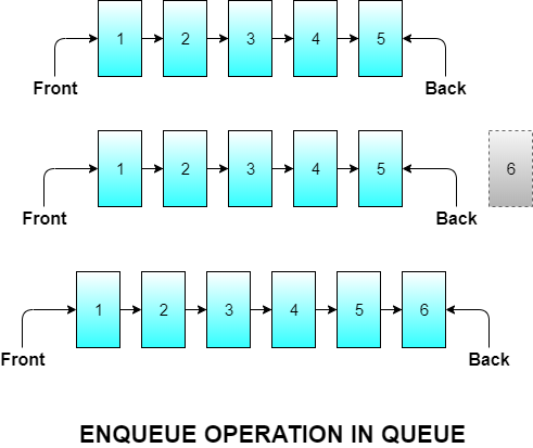 Enqueue means inserting an element in the queue. In a normal queue at a ticket counter, where does a new person go and stand to become a part of the queue? The person goes and stands in the back. Similarly, a new element in a queue is inserted at the back of the queue.