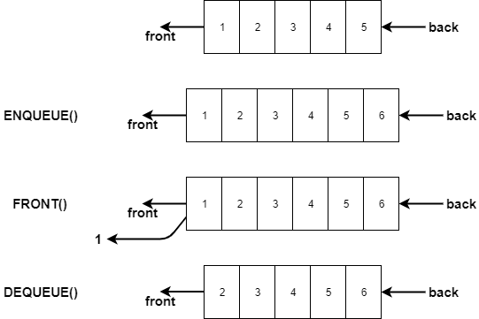 The key idea of queue implementation is to use both ends of the queue: front end for deleting elements and back/rear end for inserting elements. This is as simple as its concept because we just need to simply keep in mind all of its properties and operations.