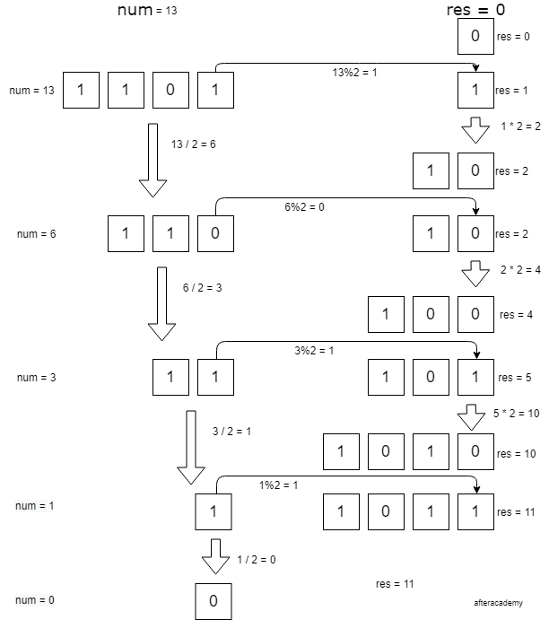 res and initialize it with 0num > 0res with 2num by 2.3. Repeat step 2, until num > 0 .