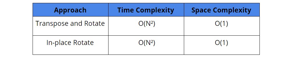 Space Complexity — O(1) Due to in-place rotation of matrix.