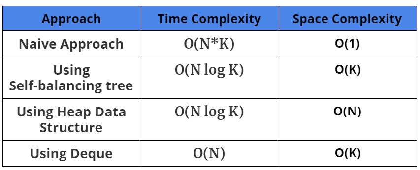 We can use a double-ended queue to keep only the indices of those elements which are useful. The use of deque is to add and drop elements from both the ends of a queue. We will slide the window of K elements by “dropping” the first element and “adding” the next element after the window to move it forward.