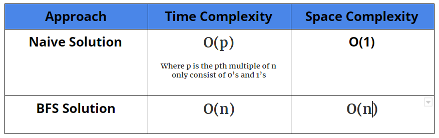 Time Complexity: O(p), where p is the pth multiple of n which is composed of only 0’s and 1’s.
