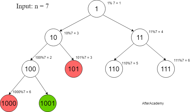 So, we can create such a tree which where each vertex will have two children containing the parent node concatenated with 0 or 1 at the end. For each vertex, we can check if the vertex’s value is a multiple of n or not.
