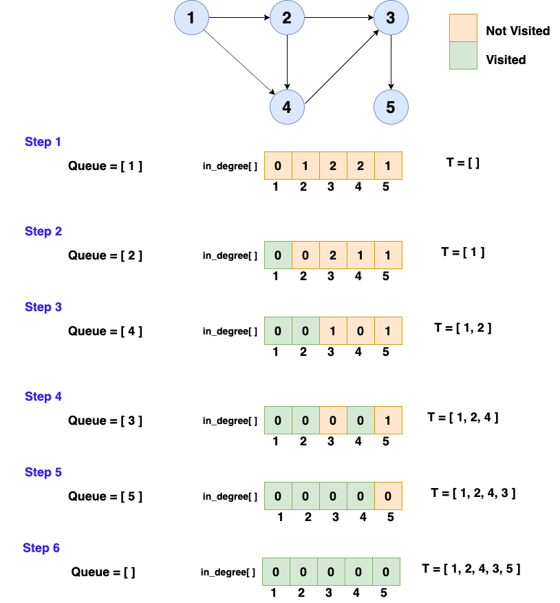 in_degree is 0. That means there is no edge that is coming into that vertex.dequeue() the front element in the Queue and push it into the T.in_degree of the vertices which has an edge with the front vertex.in_degree is 0, we will push it in Queue and also mark that vertex as visited. (Hope you must be thinking its BFS but with in_degree)