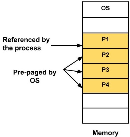 The diagram above shows that only one page was referenced or demanded by the CPU but three more pages were pre-paged by the OS. The OS tries to predict which page would be next required by the processor and brings that page proactively into the main memory.