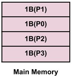 Example: We have a process P having process size as 4B, page size as 1B. Therefore there will we four pages(say, P0, P1, P2, P3) each of size 1B. Also, when this process goes into the main memory for execution then depending upon the availability, it may be stored in non-contiguous fashion in the main memory frame as shown below: