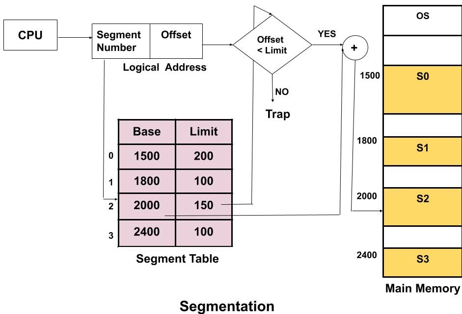 The CPU generates the logical address which contains the segment number and the segment offset. STBR register contains the address of the segment table. Now, the segment table helps in determining the base address of the segment corresponding to the page number. Now, the segment offset is compared with the limit corresponding to the Base. If the segment offset is greater than the limit then it is an invalid address. This is because the CPU is trying to access a word in the segment and this value is greater than the size of the segment itself which is not possible. If the segment offset is less than or equal to the limit then only the request is accepted. The physical address is generated by adding the base address of the segment to the segment offset.