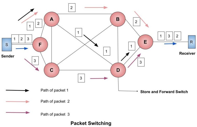 A packet contains header and payload. The header contains the routing information and the payload contains the data to be transferred. The packet switching is also based on the Store and Forward method. Each packet contains the source and destination information so, they can independently travel in the network. The packet belonging to the same file may take different paths depending upon the availability of the path. At the destination, these packets are re-assembled. It the responsibility of the receiver to re-arrange the received packet to the original data.