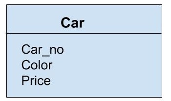 Note: Entities along with attributes are called entity type or schema. Example: Car entity has attributes Car_no, Color, Price. So, we represent an entity type as follows: