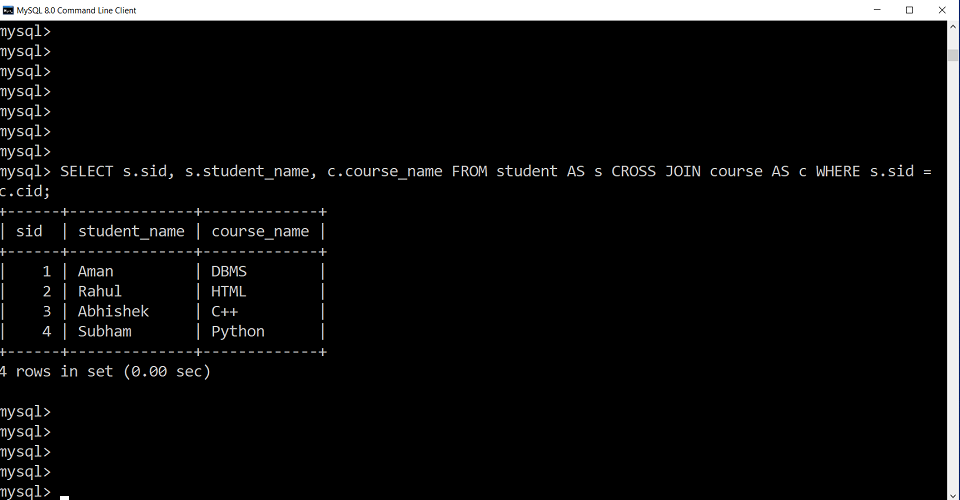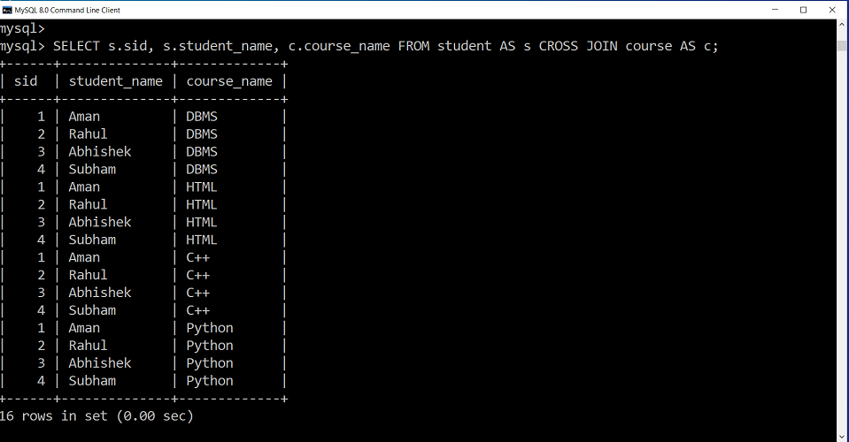 SELECT s.sid, s.student_name, c.course_name FROM student AS s CROSS JOIN course AS c;