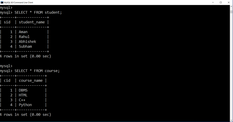 Note: In this blog, We will take all the examples using the MySQL database only. We'll be using the below-mentioned student and course table for demonstrating the examples. The tables are as follows: