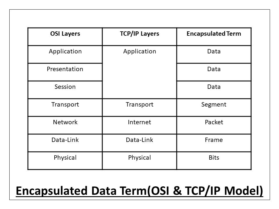 The data is encapsulated in every layer at the sender’s side and also de-encapsulated in the same layer at the receiver’s end of the OSI or TCP/IP model. Actually, we use different terms for the encapsulated form of the data that is described in the below-mentioned diagram.
