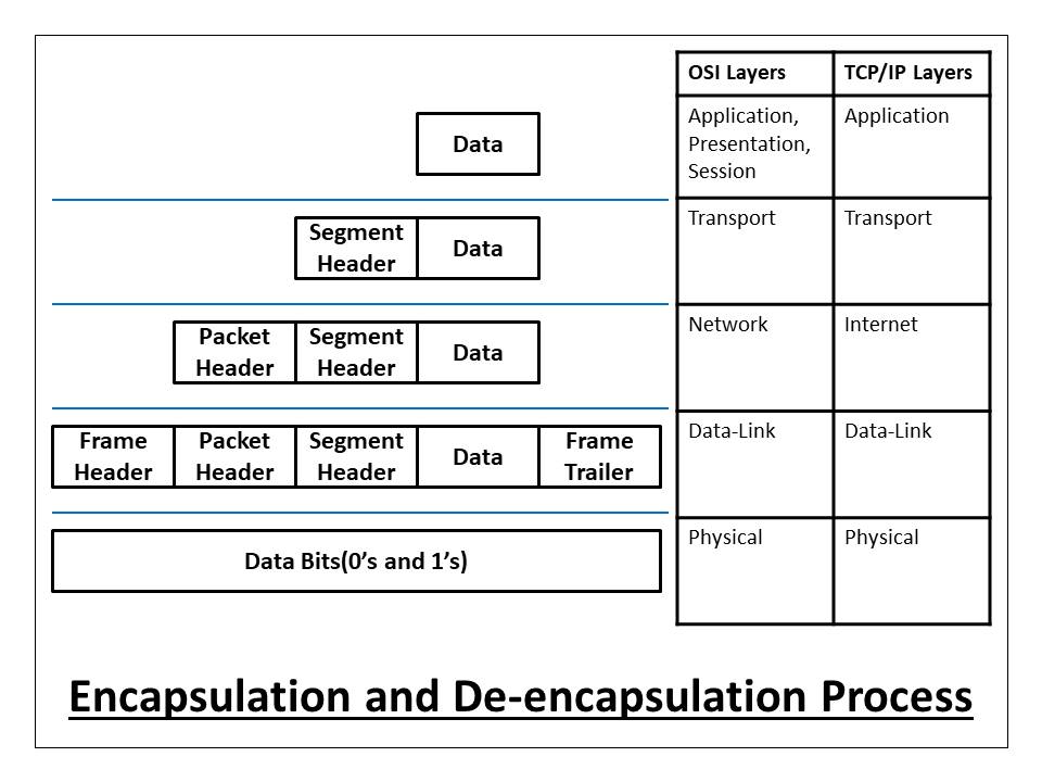 The below diagram shows how header and footer are added and removed from the data in the process of encapsulation and de-encapsulation respectively.