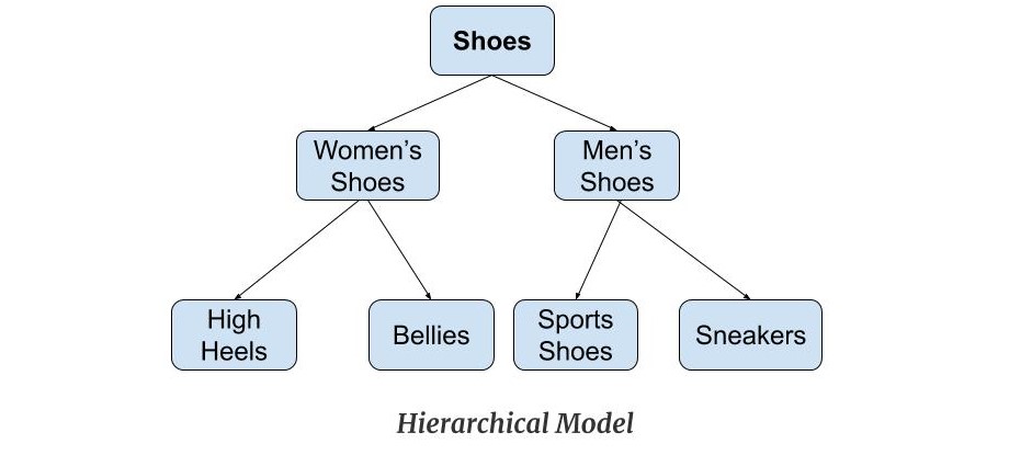 Hierarchical Model was the first DBMS model. This model organises the data in the hierarchical tree structure. The hierarchy starts from the root which has root data and then it expands in the form of a tree adding child node to the parent node. This model easily represents some of the real-world relationships like food recipes, sitemap of a website etc. Example: We can represent the relationship between the shoes present on a shopping website in the following way: