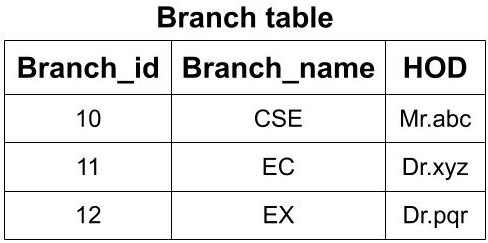 Example: Suppose after normalization we have two tables first, Student table and second, Branch table. The student has the attributes as Roll_no, Student-name, Age, and Branch_id.