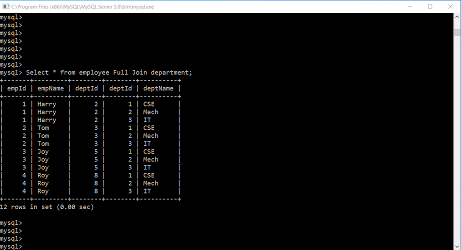 Select * from employee Full Join department;