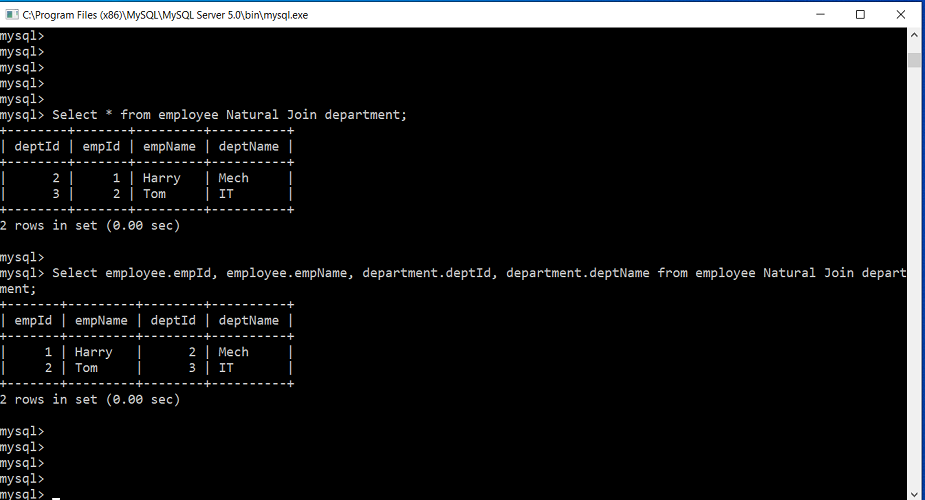 Select employee.empId, employee.empName, department.deptId, department.deptName from employee Natural Join department;