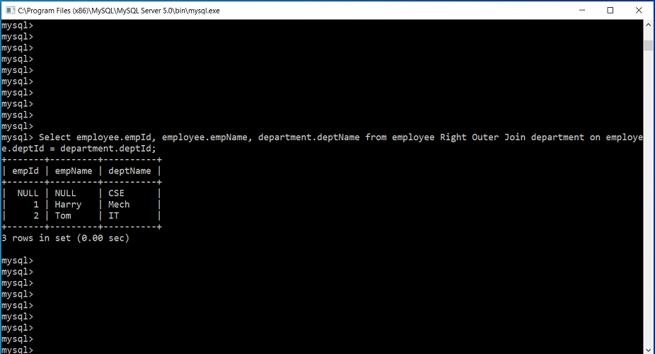 Select employee.empId, employee.empName, department.deptName from employee Right Outer Join department on employee.deptId = department.deptId;