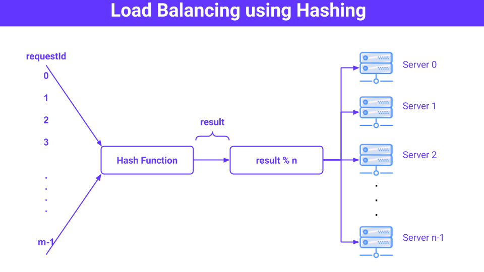 Hashing is one of the common methods used in Load Balancing. Here, we have something known as requestId that is uniquely and randomly generated. Each request by the client is uniquely identified by this requestId.
