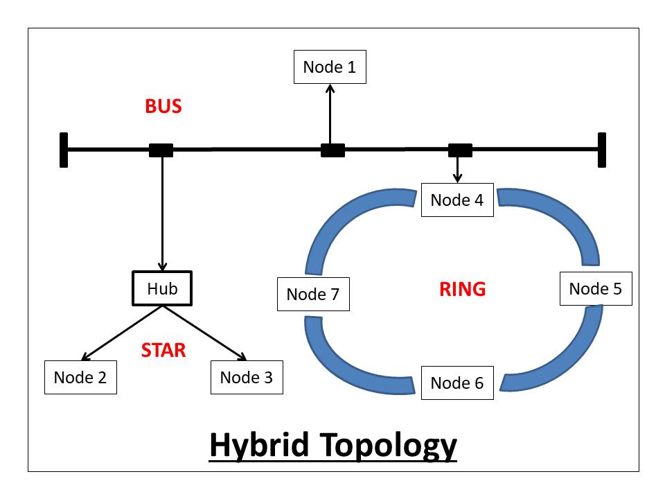 In this topology, all topologies are interconnected according to the needs to form a hybrid. All the good features of each topology can be used to make an efficient hybrid topology.